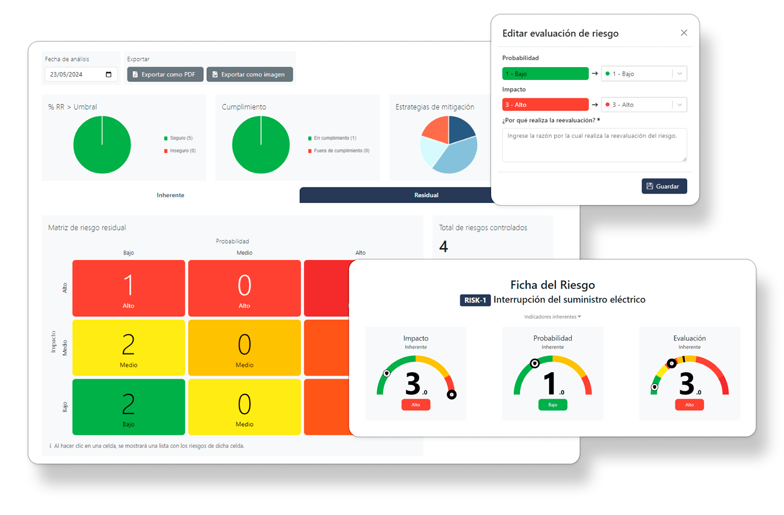 El módulo de gestión de controles de riesgos centraliza y optimiza la supervisión y ejecución de medidas de mitigación asociadas al riesgo, fortaleciendo la seguridad y el cumplimiento de los compromisos a través del uso de las tecnologías