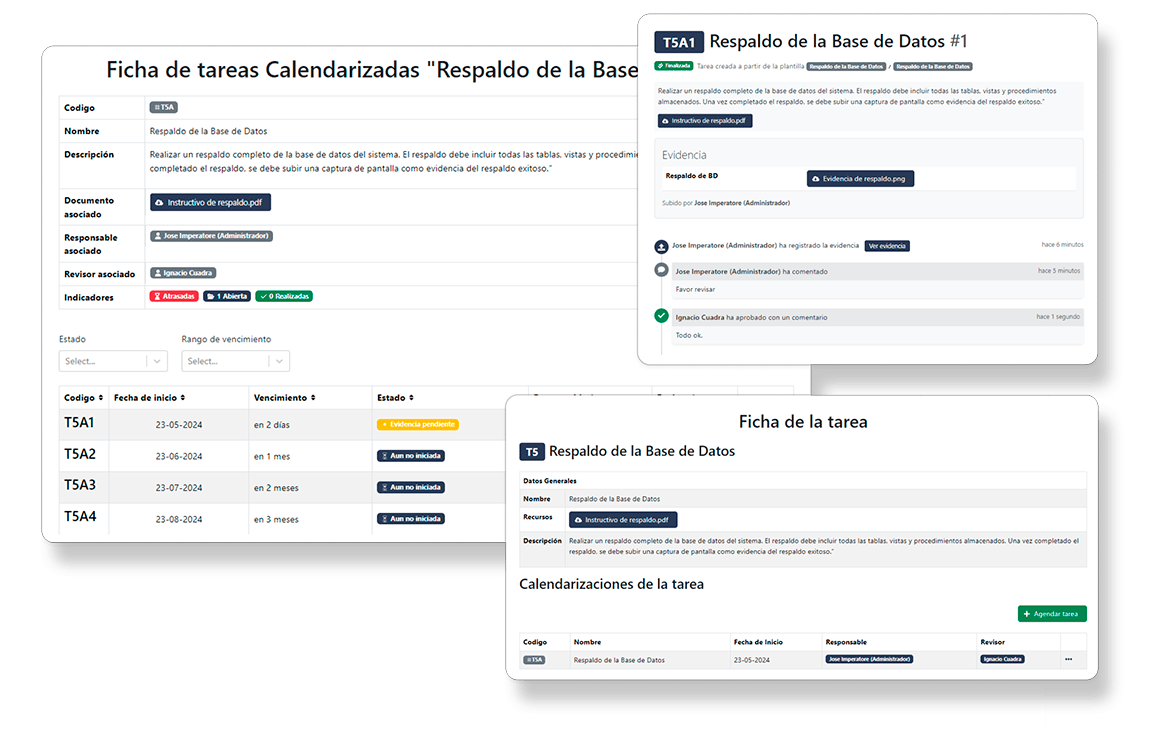 El módulo te permitirá asignar las tareas a distintos responsables y revisores, ademas de calendarizar sus tiempos y plazos de ejecución.